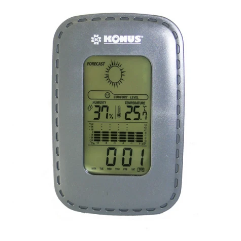 Компактна електронна метеостанція Konus Meteotrend. На дисплеї відображається: поточний час, прогноз погоди, календар, температура повітря, вологість