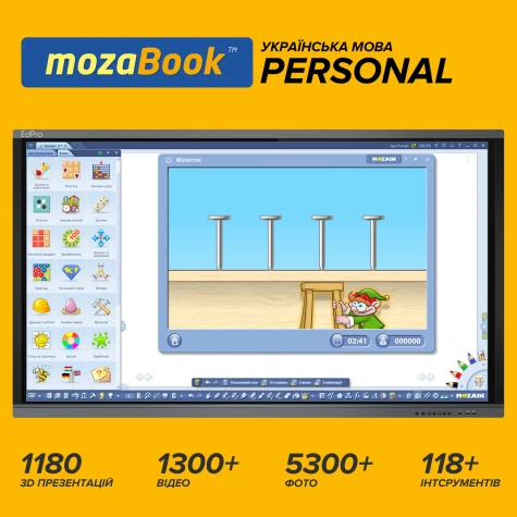 mozaBook Personal Версія для домашнього використання. Рекомендовано учням або викладачам для використання вдома під час підготовки до уроку або самостійного навчання. Не працює з підключеним проєктором або моніторах великої діагоналі (> 30''). Можна активувати тільки один раз. MozaBook урізноманітнює інструментарій шкільних уроків за рахунок численних ілюстраційних, анімаційних і творчих презентаційних можливостей. Видовищні інтерактивні елементи та вбудовані додатки, призначені для розвитку навичок, проведення дослідів й ілюстрування, пробуджують зацікавленість учнів і допомагають в більш легкому засвоєнні навчального матеріалу.
