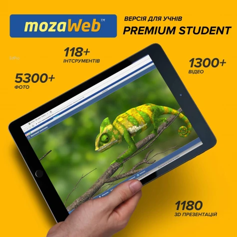 mozaWeb PREMIUM Student Pack6 Версія для учня Рекомендовано учням або викладачам для використання вдома для підготовки до уроку. Більше 1000 тривимірних сцен, кілька сотень освітніх відео, картинок, аудіо, пов'язаних із навчальними предметами додатків та ігор, які доступні в режимі oнлайн, в будь-якому місці. mozaWeb відкривається у будь-якому інтернет-браузері, для її використання не потрібне встановлення окремої програми. Рекомендовано школам для класної роботи в ОС Andorid чи IOS. Учням — для використання вдома. Повний доступ до інтерактивного змісту (3D-анімації, освітні відео) та освітніх програм на веб-сторінці mozaWeb без встановлення додаткової програми. Класна робота на планшетах з ОС Android або іOS. Виконання домашніх завдань. Не працює на екранах більших ніж 30'' чи проєкторах.