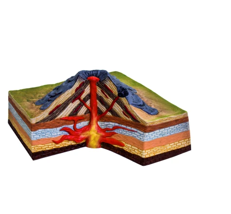 Модель демонструє будову вулкану й різні аспекти вулканічної діяльності: конус виносу, кратер вулкана, лава вулканічна, барранкоси, фумароли, берег моря.