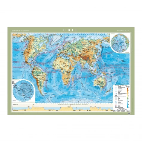 Фізична карта світу на планках використовується в кабінеті географії загальноосвітнього навчального закладу. Служить для демонстрації рельєфу земної поверхні та розташування основних материків. На карті детально зображено розташування материків, морів, океанів, озер, проток, течій, рівнин, гір та систем хребтів. Настінна карта світу не зображає країни, а лише найбільші міста та рельєф всього світу. Добре помітний перепад висот в різних частинах світу (чим темніший колір, тим вище поверхня над рівнем моря). Материки та континенти: Євразія, Південна та Північна Америка, Африка, Австралія, Антарктида. Океани: Тихий, Індійський, Атлантичний, Льодовиковий.