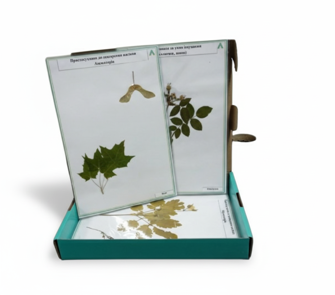 Гербарій «Ідіоадаптація у рослин» демонструє приклади пристосувань рослин до умов середовища, містить 10 ламінованих зразків із назвами, малюнками та фото, призначений для використання на уроках природознавства та ботаніки.