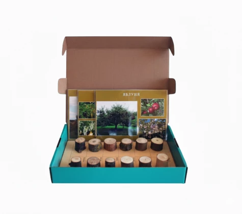 Колекція зразків деревини з картками та методичним матеріалом допомагає учням досліджувати будову, колір і текстуру деревини різних порід, розвиваючи спостережливість і пізнавальні навички під час вивчення біології.