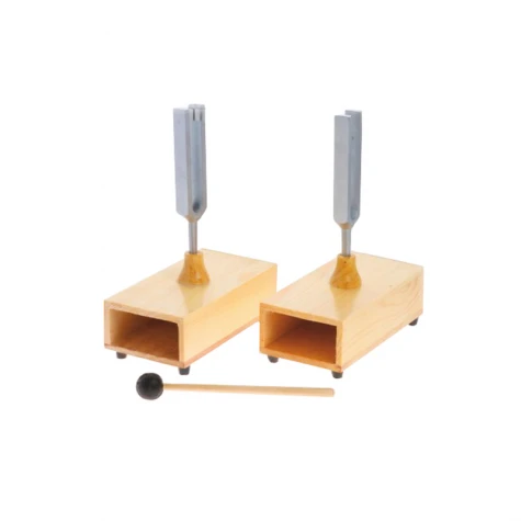 Камертони на резонансних ящиках використовуються в кабінеті фізики для демонстрування явища звукового резонансу, інтерференції звукових хвиль і можуть служити в якості джерела звуку. Камертон являє собою масивну вилку зі сталі на ніжці. Довжина гілок вилки має визначену довжину. Резонансні ящики приладу з однієї сторони мають отвір. Втулка для встановлення камертона міститься на верхній дошці ящика, а на нижній дошці знаходяться гумові ніжки. З допомогою магніту, який переміщується уздовж ніжки одного з приладів проводиться налаштування камертонів в унісон (нота "ля" першої октави). Допомагає оволодіти практичним засвоєнням основних музичних понять і термінів; вчить елементам гри на музичних інструментах: народних, сучасних (електронних); формує навички інструментальної імпровізації у процесі творчого самовираження.