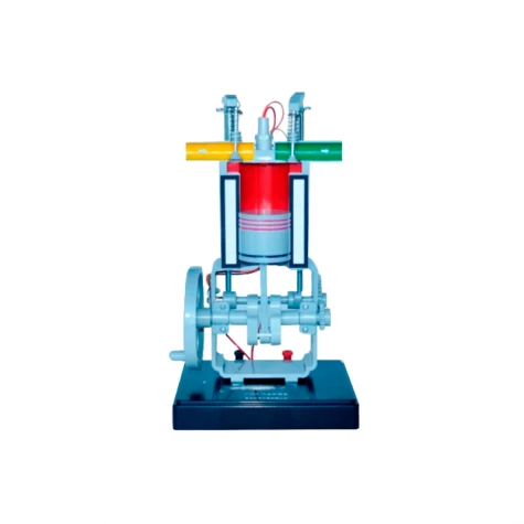 Модель двигуна внутрішнього згоряння використовується в кабінеті фізики загальноосвітнього навчального закладу під час вивчення курсу молекулярної фізики і термодинаміки. Призначена для демонстрації принципу роботи даного двигуна, як практичного застосування першого закону термодинаміки. Прилад являє собою об'ємної форми кінематичну модель у вигляді розрізу двигуна внутрішнього згоряння. Всі деталі яскраво забарвлені. За допомогою обертання ручки забезпечується взаємодія елементів двигуна.
