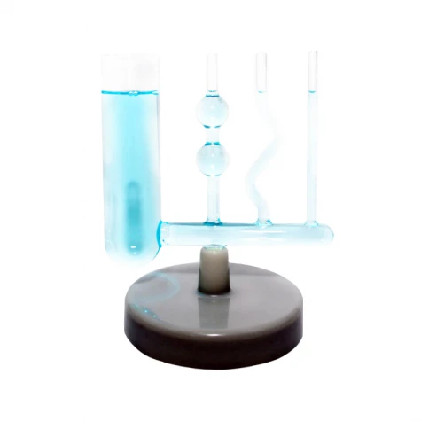 Прилад «Сполучені посудини» призначений для демонстрації властивостей сполучених посудин. Габаритні розміри в упаковці (Д. * Шир. * Вис.), См: 31 * 16 * 5. Вага, кг, не більше 0,4. Комплектність: посудини, змонтовані на загальній основі - 1 шт., Керівництво з експлуатації - 1 шт. Прилад являє собою набір прозорих трубок (судин) різної форми, змонтованих на загальних підставах (колекторі) з підставкою