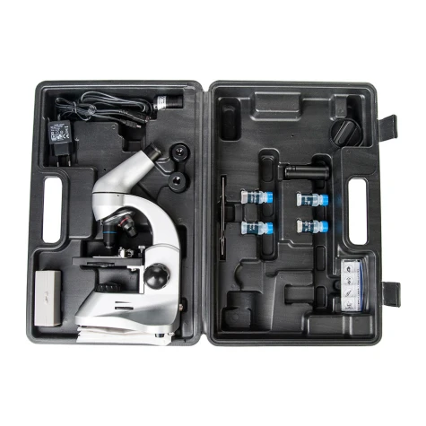 Мікроскоп біологічний з камерою 2МР в кейсі (цифровий). За допомогою цифрового окуляра, підключеного до комп'ютера через USB-порт, можна виводити зображення з мікроскопа на великий екран. Роздільна здатність камери (2 Mp) дозволяє робити якісні цифрові знімки, придатні для редагування і публікації онлайн. входять інструменти для препарування, готові слайди і витратні матеріали. Збільшення: 20x-1280x. Камера-окуляр: USB, 2 Mp. Об'єктиви: лінзові 4x, 10x, 40x(s). Окуляри: WF5x, WF16x. Лінза Барлоу: 1x-2x. Оптична довжина тубуса: 160 мм. Тип мікроскопії: світлого поля. Предметний столик: 90 x 96 мм. Тип освітлення: LED лампи з плавним регулюванням яскравості. Живлення: від батарейок або від мережі 220 В.