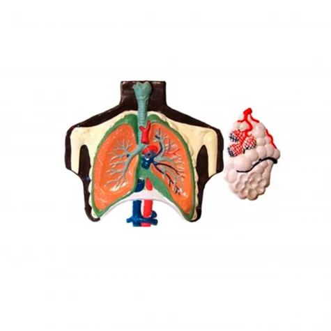 Модель демонструє дихальну систему людини у розрізі, що дозволяє учням ознайомитись з анатомічною будовою легенів та альвеол. Виготовлена з листового термопластика з глибиною рельєфу до 3 см. Зображення забарвлено в природні кольори. Розміри моделі 60x40 см.