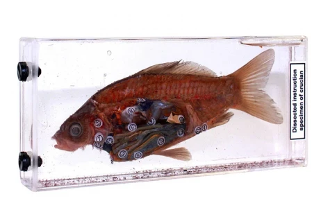 Препарат «Риба» призначений для використання у загальноосвітніх закладах в якості демонстраційного матеріалу на уроках біології у розділі «Тварини», тема «Риби». Містить позначення органів тіла тварини. Демонструє зовнішню і внутрішню будову. Препарат змонтований на скляній пластині, яка поміщена в герметично закриту посудину з консервуючої рідиною. Характеристики: Матеріал: скло, біологічні матеріали Розміри: 75*35*12 мм
