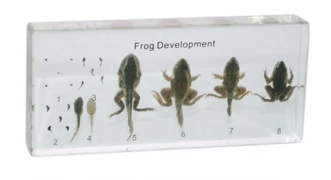 Препарат «Розвиток жаби» призначений для використання у загальноосвітніх закладах в якості демонстраційного матеріалу на уроках біології у розділі «Тварини», тема «Плазуни». Містить позначення органів тіла тварини. Демонструє етапи розвитку жаби від запліднених ікринок до стадії розвитку пуголовка та молодої жаби. Препарат змонтований на скляній пластині, яка поміщена в герметично закриту посудину з консервуючої рідиною. Характеристики: Матеріал: скло, біологічні матеріали Розміри: 60*30*15 мм