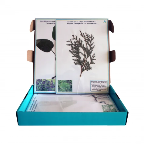 Гербарій використовується в якості демонстраційного матеріалу під час вивчення біології в загальноосвітній школі. В гербарії представлені зразки, засушені та прикріплені до листів А4 формату. Також на гербарних листах міститься назва зразка та повнокольорове фото зображення рослини. Всі гербарні листи ламіновані, що не пошкоджує натуральний зразок. До складу входить: - 17 гербарних зразків – прості листки – 6 одиниць; складні листки – 3 одиниці; родина Ліщинові – 1 одиниця; родина Березові – 1 одиниця; родина Барбарисові – 1 одиниця; родина Лілійні – 1 одиниця; родина Хрестоцвіті – 2 одиниці; родина Айстрові – 1 одиниця; родина Розові – 1 одиниця. Характеристики: Матеріал: ламіновані листи формату А4 Комплектація: 17 шт. Гербарій постачається в картонній коробці розмірами 320*250*45 мм.
