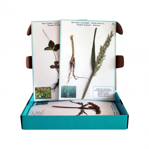 Гербарій використовується в якості демонстраційного матеріалу під час вивчення біології в загальноосвітній школі. В гербарії представлені зразки, засушені та прикріплені до листів А4 формату. Також на гербарних листах міститься назва зразка та повнокольорове фото зображення рослини. Всі гербарні листи ламіновані, що не пошкоджує натуральний зразок. До складу входить: - 10 гербарних зразків – гірчиця, календула, капуста, картопля, кульбаба, полин, редис, ромашка аптечна, томат звичайний, деревій. Характеристики: Матеріал: ламіновані листи формату А4 Комплектація: 10 шт. Гербарій постачається в картонній коробці розмірами 320*250*45 мм.