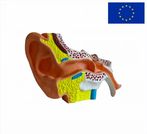 Модель використовується для демонстрації на уроках біології. Призначена для проведення контрольних, лабораторних робіт, а також усних опитувань при вивченні розділу «Людина». Модель є розбірною, демонструє будову вуха людини. Кольором виділені деталі будови вуха людини, а саме – вушна раковина, равлик, зовнішній слуховий прохід, вестибулярний апарат, барабанна перетинка, слухова труба, слухові кісточки.