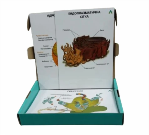 Модель використовується на уроках біології в загальноосвітній школі для вивчення та освоєння розділу «Загальна біологія». Всі картки виготовлені на магнітній основі. До складу входить: керівництво по експлуатації; плакати з зображенням порожніх оболонок тваринної та рослинної клітин – 2 шт.; картки-зображення різноманітних структур та органоїдів клітин – 10 шт. Характеристики: Матеріал: картон Колір: яскраві природні кольори Комплектація: 12 шт.
