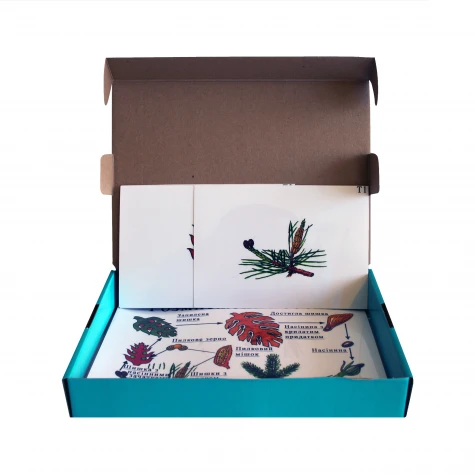 Модель-аплікація використовується в якості демонстраційного матеріалу під час вивчення біології в загальноосвітній школі для вивчення розділу «Рослини. Бактерії. Гриби. Лишайники». Дана модель демонструє особливості розмноження голонасінних на прикладі сосни. Картки зручні у використанні завдяки магнітним кріпленням, які дають змогу демонструвати посібник на металевій класній дошці без застосування додаткового кріплення. До складу входить: 8 ламінованих карток, оснащених магнітним кріпленням; ламінована вкладка з детальною схемою розмноження сосни; вкладка для вчителя з інформацією про використання моделі. Характеристики: Матеріал: ламіновані листи формату А4 та А5 Комплектація: 10 шт. Модель постачається в картонній коробці розмірами 320*250*45 мм.