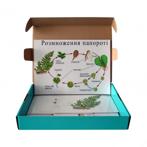 Модель-аплікація використовується в якості демонстраційного матеріалу під час вивчення біології в загальноосвітній школі для вивчення розділу «Рослини. Бактерії. Гриби. Лишайники». Дана модель демонструє етапи життєвого циклу папороті на прикладі щитовника чоловічого. Картки зручні у використанні завдяки магнітним кріпленням, які дають змогу демонструвати посібник на металевій класній дошці без застосування додаткового кріплення. Допомагає учням у засвоєнні знань про закономірності функціонування живих систем, їх розвиток та взаємодію, взаємозв'язок із живою природою та формування уявлень про природничо-наукову картину живого світу. До складу входить: 8 ламінованих карток, оснащених магнітним кріпленням; ламінована вкладка з детальною схемою розмноження папороті; вкладка для вчителя з інформацією про використання моделі.