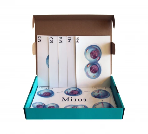 Модель використовується для кабінету біології загальноосвітнього навчального закладу при вивченні розділу «Загальна біологія» теми «Генетика». Демонструє статеві клітини, з яких на дошці монтується схема мітозу. Магнітні стрічки на звороті дають змогу користуватися картками на металевій класній дошці без застосування додаткового кріплення. Допомагає учням у засвоєнні знань про закономірності функціонування живих систем, їх розвиток та взаємодію, взаємозв'язок із живою природою та формування уявлень про природничо-наукову картину живого світу. До складу входить: керівництво по експлуатації для вчителя; 7 ламінованих карток з магнітним кріпленням.