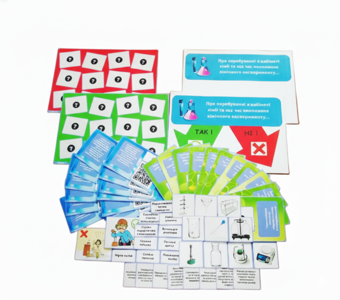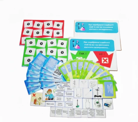 Дидактичний набір із 155 карток допомагає учням у практичній та ігровій формі вивчати лабораторний посуд і обладнання з хімії, розвиваючи уважність, логіку та навички співставлення інформації через інтерактивні завдання й QR-підказки.