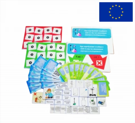 Також, у комплект входять картки з завданнями практичного спрямування. Для вирішення цих завдань, учням доведеться пригадати все раніше вивчене про лабораторний посуд, обладнання і його призначення; проаналізувати та співставити все вищезгадане з завданням і, після цього, обрати правильну відповідь.