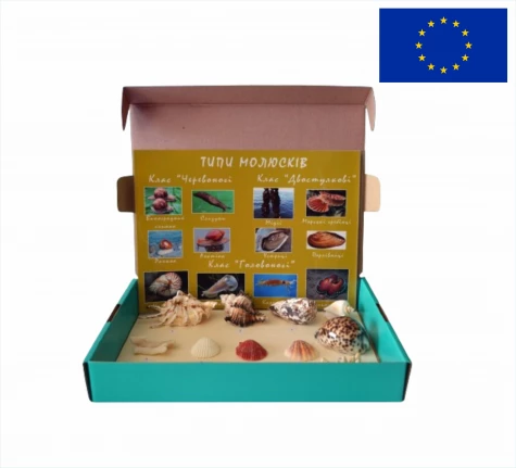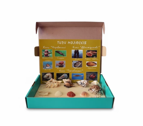 Колекція містить 14 зразків молюсків і морських організмів із навчальними вкладками та сприяє розвитку дослідницьких навичок і вміння визначати взаємозв'язки у природі.