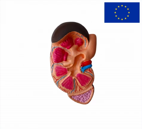 Модель використовується для демонстрації на уроках біології. Призначена для проведення контрольних, лабораторних робіт, а також усних опитувань при вивченні розділу «Людина». Модель розбірна, демонструє сагітальний розріз і будову нирки людини. Кольором виділено частини нирки людини – капсула нирки, ниркові стовпи, коркова речовина, мозкова речовина (піраміди),малі ниркові чашки, велика ниркова чашка, сечовід, ниркова балія, нерв, ниркова артерія, ниркова вена.