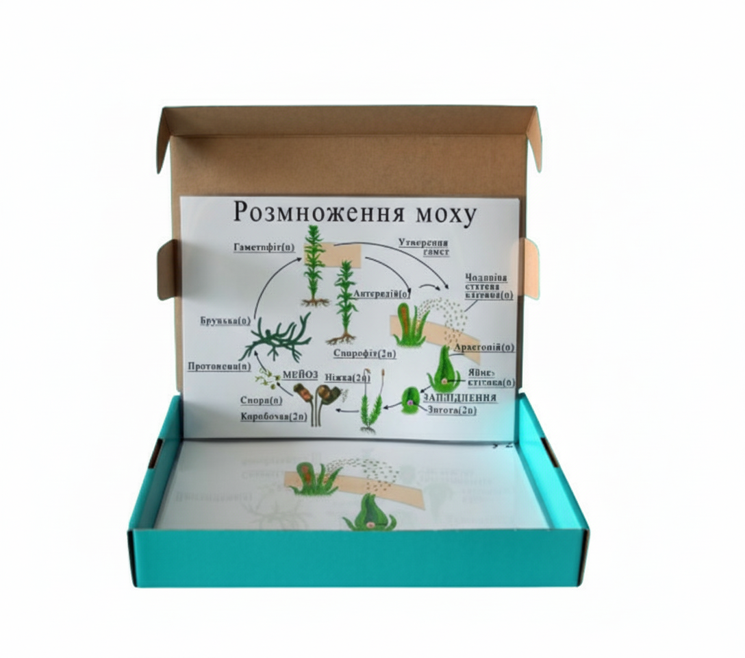 Модель-аплікація демонструє процес розмноження зелених мохів на прикладі зозулиного льону, призначена для використання під час вивчення розділу «Рослини. Бактерії. Гриби. Лишайники» у курсі біології, відповідає вимогам Концепції Нової української школи.