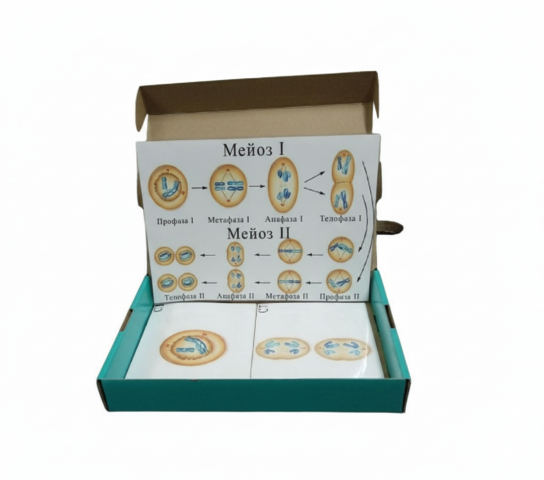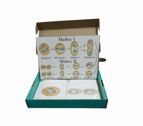 Модель демонструє процес мейозу на основі магнітних карток зі статевими клітинами, призначена для вивчення теми «Генетика» в курсі «Загальна біологія», відповідає вимогам НУШ.