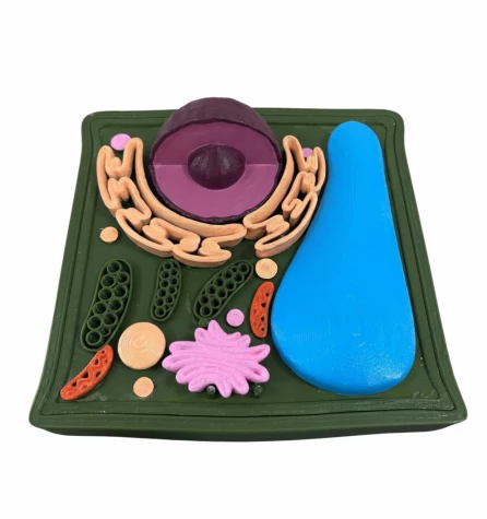 Модель демонструє зовнішню й внутрішню будову рослинної клітини та її органоїдів, виготовлена з міцної пластмаси, пофарбована в яскраві кольори й встановлена на підставку.