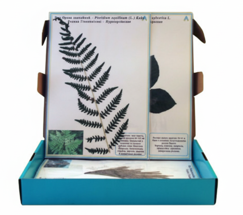 Гербарій містить 10 ламінованих зразків рослин із назвами, фото та інформацією про природні місця зростання, призначений для демонстрацій і досліджень на уроках біології.