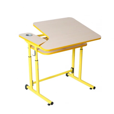Дані парти виготовляються на високотехнологічному обладнанні, металеві частини захищені надсучасним порошковим покриттям. Вони відповідають всім вимогам нормативних актів і супроводжуються гігієнічними висновками та сертифікатами відповідності. Стіл учнівський 1-місний з полицею з регулюванням кута нахулу стільниці, №4-6 Габаритні розміри: 750х550х640-760 мм. Вага: 14.80 кг. Регулювання по висоті на ростові групи №4-6. Кут нахилу столешні 0 - 80º. Стільниця (має нерухому площадку з вирізом під стакан) та поличка - ДСП 18 мм. ПВХ 1 мм - жовтий. Каркас: труба 20х20х1,5 мм, d25x1,2 мм, d32x1,2 мм. Порошкове фарбування жовтого кольору. Колір каркасу: жовтий. Колір ДСП: дуб молочний.