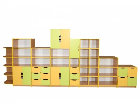 Стінку рекомендовано для облаштування молодшої школи. Елементи можна по різному комбінувати. Стінка функціональна та використовується для зберігання дидактичного матеріалу, книжок, папок, особистих речей малюків. Дана модель якісна, сучасна й доступна за ціною. Стінка універсальна «Школа-Сад» Габаритні розміри: 4310х410х1885 мм. Вага: 280,50 кг. Виготовлена з ДСП: фасади 18 мм та корпус 16 мм. Стінка призначена для умеблювання садочків та молодшої школи, можлива різнопланова комбінація елементів, є функціональною та призначена для зберігання дидактичного матеріалу, книг, папок, особистих речей дітей. Оклейка: ПВХ жовтого кольору товщиною 1 мм. КомбінаціЇ кольорів: Колір корпусу: бук, колір фасаду: жовтий/лайм. Колір корпусу: дуб молочний, колір фасаду: жасмін/лаванда.