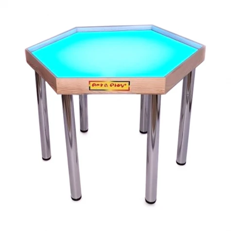 Розмір шестикутної стільниці 1000х870х80мм; Хромовані ніжки легкі. Завдяки різьбовому кріпленню, легко монтуються і демонтуються без додаткового інструменту. Можна використовувати, як 2 в 1:шестикутний планшет і стіл. Максимальна висота хромованих ніжок H=71см + 5 см для регулювання. При замовленні можна вказати потрібну висоту ніжок від 10 до 71см (враховуйте висоту стільниці 8см). Столи мобільні та легкі Висота борту ергономічна та спеціально підібрана фахівцями для зручності малювання (не заламує ручки) Матеріал каркаса виготовлений з натурального дерева - ясний (цінна порода) Дерево жінці, шліфоване, не виділяє смол, задирки виключені. Додатково дерев'яна яний каркас ретельно зачищено вручну, що забезпечує ідеальну гладкість дерева Дерев'яна яний каркас пофарбован захисним покриттям високої якості, яке не має запаху. Покриття екологічне, антиалергенне, придатне для дитячих іграшок За бажанням, можливе фарбування каркаса в інший тон (дуб, червоне дерево, горіх, палісандр, тік, сосна) або будь - який інший колір.Робоча поверхня виготовлена з матового оргскла. Оргськло є екологічним продуктом, стійке до механічних навантажень (безпечно); Ігрове поле не нагрівається Різнокольорова світлодіодна підсвітка Різнокольорова: 16 кольорів, включно білий; Інфрачервоний RGB контролер світлодіодної стрічки; Кнопочний пульт керування на 24 або 44 кнопки для вибору кольору і регулювання яскравості, функція пам'яті режимів світіння; Блок живлення В комплекті: Інструкція Методичний посібник Гарантія та обслуговування від 12 місяців Пісок для малювання не менше 4кг Набір для прибирання