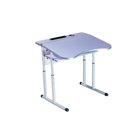 Стіл складається з стільниці ергономічної форми (закруглені кути з 4-х сторін), екрану та полиці між металевими каркасами. На боковій стійці каркасу закріплений гачок. Стільниця столу складається з двох частин. Та частина стільниці, що знаходиться із сторони сидячого, розміщена під кутом 7°. Інша частина стільниці знаходиться в горизонтальному положенні. Стільниця містить отвір для стакану з канцелярським приладдям, та пенал.