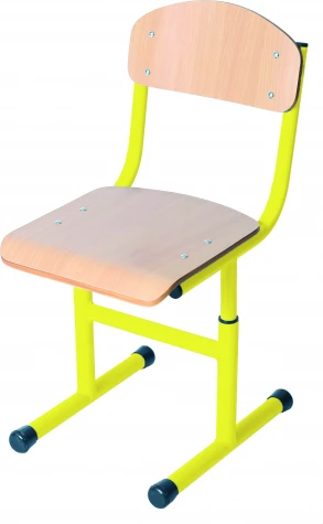 Стілець Т-подібний на круглій трубі, регулюється на ростові групи №2-5, з покриттям HPL Габаритні розміри: 331х417х618-738 мм (h=300-420 мм). Вага: 2.96 кг. Каркас – кругла металева труба розміром d32х1,2 мм та d25х1,2 мм, а перемичка з плоскоовальної труби d30x15 мм. Покриття нанесене напиленням порошкових полімерних матеріалів. Сидіння та спинка виготовлені з гнуто-клеєної фанери та вкриті HPL пластиком товщиною 0,4-0,5 мм.