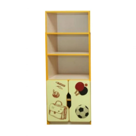 Стінка універсальна "Школа-Сад" елемент №2+Ф "Пізнайко №3" Габаритні розміри: 600х410х1594 мм. Вага: 36,08 кг. Шафа напівзакрита 2-дверна. Виготовлена з ламінованої ДСП: корпус 16 мм, фасад 18 мм. Задня стінка виготовлена з білої ламінованої ДВП товщиною 3 мм. Оклейка: ПВХ жовтого кольору товщиною 1 мм. Фотодрук зі шкільною тематикою здійснюється на плиті ДСП із застосуванням спеціальних чорнил, які затвердівають під дією випромінювання спеціальних ультрафіолетових ламп. Також застосовується технологія покриття лаком самого малюнку для збільшення стійкості до зовнішніх пошкоджень, стирання та вологого прибирання. Можлива комбінація кольорів: Колір корпусу: дуб молочний, колір фасаду: жасмін.