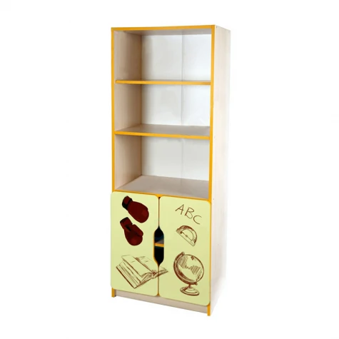 Стінка універсальна "Школа-сад" елемент №2 + Ф "Пізнайко №4" Габаритні розміри: 600х410х1594 мм. Вага: 36,08 кг. Шафа напівзакритий 2-дверний. Виготовлений з ламінованої ДСП: корпус 16 мм, фасад 18 мм. Задня стінка виготовлена з білої ламінованої ДВП товщиною 3 мм. Обклеювання: ПВХ жовтого кольору товщиною 1 мм. Фотодрук на шкільну тематику здійснюється на плиті ДСП із застосуванням спеціального чорнила, які тверднуть під дією випромінювання спеціальних ультрафіолетових ламп. Також застосовується технологія покриття лаком самого малюнка для збільшення стійкості до зовнішніх пошкоджень, стирання і вологого прибирання. Можлива комбінація кольорів: Колір корпусу: дуб молочний, ц вет фасаду: жасмин.
