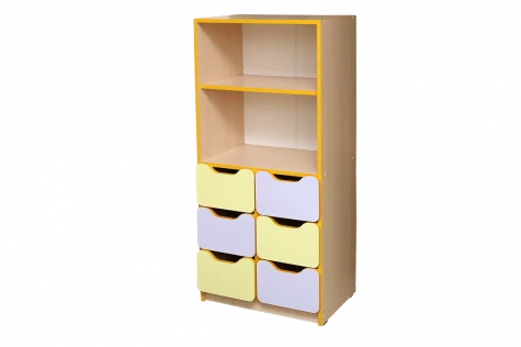 Стінка універсальна "Школа-Сад" елемент №3 Габаритні розміри: 600х410х1303 мм. Вага: 43,00 кг. Стелаж з 6-ма шухлядами повного висування. Виготовлений з ДСП: корпус 16 мм, фасад 18 мм. Задня стінка виготовлена з білої ламінованої ДВП товщиною 3 мм. Оклейка: ПВХ жовтого кольору товщиною 1 мм. Можлива комбінація кольорів: Колір корпусу: бук, колір фасаду: жовтий/лайм. Колір корпусу: дуб молочний, колір фасаду: жасмін/лаванда