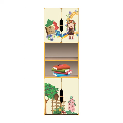 Стінка універсальна "Школа-Сад" елемент №4+Ф "Українські традиції №1" Габаритні розміри: 600х410х1885 мм. Вага: 48,5 кг. Шафа напівзакрита 4-дверна. Виготовлена з ламінованої ДСП: корпус 16 мм, фасад 18 мм. Задня стінка виготовлена з білої ламінованої ДВП товщиною 3 мм. Оклейка: ПВХ жовтого кольору товщиною 1 мм. Фотодрук в стилі українських народних мотивів здійснюється на плиті ДСП із застосуванням спеціальних чорнил, які затвердівають під дією випромінювання спеціальних ультрафіолетових ламп. Також застосовується технологія покриття лаком самого малюнку для збільшення стійкості до зовнішніх пошкоджень, стирання та вологого прибирання. Можлива комбінація кольорів: Колір корпусу: дуб молочний, колір фасаду: жасмін.