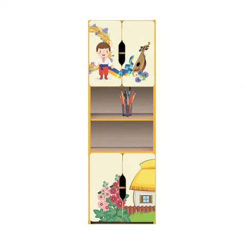 Стінка універсальна "Школа-Сад" елемент №4+Ф "Українські традиції №2" Габаритні розміри: 600х410х1885 мм. Вага: 48,5 кг. Шафа напівзакрита 4-дверна. Виготовлена з ламінованої ДСП: корпус 16 мм, фасад 18 мм. Задня стінка виготовлена з білої ламінованої ДВП товщиною 3 мм. Оклейка: ПВХ жовтого кольору товщиною 1 мм. Фотодрук в стилі українських народних мотивів здійснюється на плиті ДСП із застосуванням спеціальних чорнил, які затвердівають під дією випромінювання спеціальних ультрафіолетових ламп. Також застосовується технологія покриття лаком самого малюнку для збільшення стійкості до зовнішніх пошкоджень, стирання та вологого прибирання. Можлива комбінація кольорів: Колір корпусу: дуб молочний, колір фасаду: жасмін.