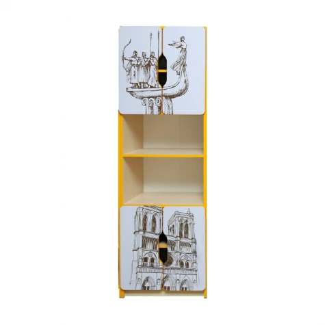 Стінка універсальна "Школа-Сад" елемент №4+Ф "Шкільна подорож №1" Габаритні розміри: 600х410х1885 мм. Вага: 48,5 кг. Шафа напівзакрита 4-дверна. Виготовлена з ламінованої ДСП: корпус 16 мм, фасад 18 мм. Задня стінка виготовлена з білої ламінованої ДВП товщиною 3 мм. Оклейка: ПВХ жовтого кольору товщиною 1 мм. Фотодрук їз зображенням визначних пам’яток світу здійснюється на плиті ДСП із застосуванням спеціальних чорнил, які затвердівають під дією випромінювання спеціальних ультрафіолетових ламп. Також застосовується технологія покриття лаком самого малюнку для збільшення стійкості до зовнішніх пошкоджень, стирання та вологого прибирання. Можлива комбінація кольорів: Колір корпусу: дуб молочний, колір фасаду: лаванда.