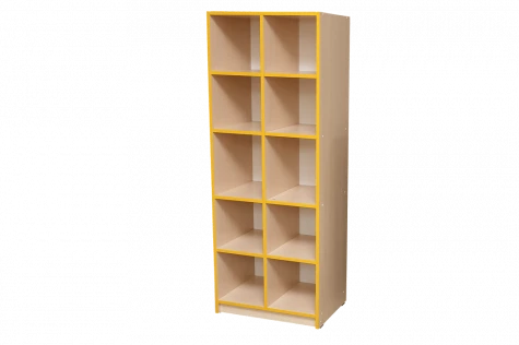 Стінка універсальна "Школа-Сад" елемент №6 Габаритні розміри: 600х410х1594 мм. Вага: 40,50 кг. Стелаж відкритий з 10-ма комірками. Виготовлений з ДСП 16 мм. Задня стінка виготовлена з білої ламінованої ДВП товщиною 3 мм. Оклейка: ПВХ жовтого кольору товщиною 1 мм. Колір корпусу: бук або дуб молочний.