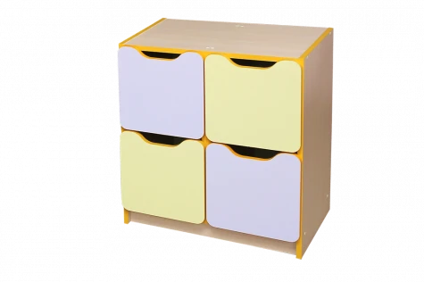 Стінка універсальна "Школа-Сад" елемент №8 Габаритні розміри: 600х410х665 мм. Вага: 34,00 кг. Комод з 4-ма шухлядами повного висування. Виготовлений з ДСП: корпус 16 мм, фасад 18 мм. Задня стінка виготовлена з білої ламінованої ДВП товщиною 3 мм. Оклейка: ПВХ жовтого кольору товщиною 1 мм. Можлива комбінація кольорів: Колір корпусу: бук, колір фасаду: жовтий/лайм. Колір корпусу: дуб молочний, колір фасаду: жасмін/лаванда.