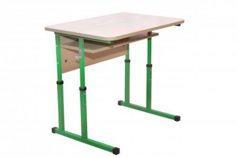 Стіл учнівський 1-місний з полицею, регулюється на ростові групи № 4-6 Габаритні розміри: 700х500х640-760 мм. Вага: 12,12 кг. Металеві частини стола учнівського виготовлені з квадратної труби 25х25х1,2 мм і 20х20х1,2 мм та мають захисне декоративне покриття – емаль порошкова. Регулювання висоти столу здійснюється за допомогою гвинтів по отворах каркасу і ніжки, між якими встановлена пластикова перехідна втулка. На торцях каркасу закріплені пластикові наконечники, які запобігають травмуванню учнів та пошкодженню підлоги. Стільниця із заокругленими кутами, виготовлена із ламінованої ДСП товщиною 18 мм, ПВХ - 1 мм, екран та полиця виготовлені з ламінованої ДСП товщиною 16 мм. Колір ДСП: бук, дуб молочний. Колір каркасу: салатовий (RAL6018), сірий (RAL7035).