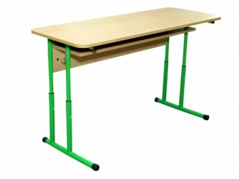 Стіл учнівський 2-місний з полицею, регулюється на ростові групи № 4-7 Габаритні розміри: 1300х500х640-820 мм. Вага: 21 кг. Каркас – кругла металева труба d25/d32 мм, покриття нанесене напиленням порошкових полімерних матеріалів. Стільниця із заокругленими кутами, виготовлена із ламінованої ДСП товщиною 18 мм, ПВХ - 1 мм, екран та полиця - з ламінованої ДСП товщиною 16 мм. На каркасі присутнє маркування ростових груп при регулюванні висоти столу. Колір ДСП: бук, дуб молочний. Колір каркасу: салатовий (RAL6018), сірий (RAL7035).