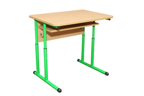 Стіл учнівський 1-місний з полицею, регулюється на ростові групи № 4-6 Габаритні розміри: 700х500х640-760 мм. Вага: 12,7 кг. Каркас – кругла металева труба d25/d32 мм, покриття нанесене напиленням порошкових полімерних матеріалів. Стільниця із заокругленими кутами, виготовлена із ламінованої ДСП товщиною 18 мм, ПВХ - 1 мм, екран та полиця - з ДСП ламінованої товщиною 16 мм. На каркасі присутнє маркування ростових груп при регулюванні висоти столу. Колір ДСП: бук, дуб молочний. Колір каркасу: салатовий (RAL6018) або сірий (RAL7035).