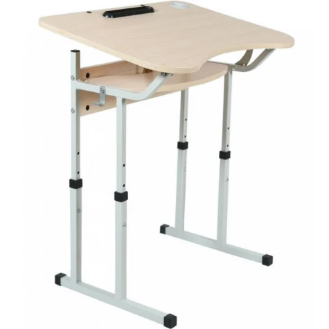 Стіл учнівський 1-місний з регулюванням кута нахилу стільниці та полицею, ростова група №3-6 Габаритні розміри столу: 700x500x580-760 мм. Вага: 10,5 кг. Розміри столу: ширина – 700 мм; глибина – 500 мм; висота – 580, 640, 700, 760 мм; кути нахилу стільниці: 0°, 3°, 5°, 7°, 9°, 12°, 14°, 16°. Стіл складається з стільниці ергономічної форми та металевого каркасу. Усі кути стільниці заокруглені. Стільниця має ергономічний виріз з боку учня, що забезпечує глибшу посадку та убезпечує сидячого від викривлення осанки. Регулювання кута нахилу стільниці здійснюється за рахунок механізму, типу ростомата з кроком регулювання до 3°, з обов’язковою наявністю обмежувачів для безпеки використання учнями. На горизонтальній частині стільниці з правої сторони робочого місця міститься отвір для стакану канцелярії, посередині пенал для канцелярського приладдя, отвори під книготримач.