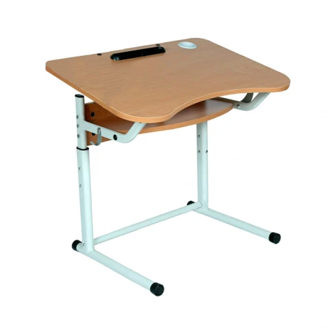 Обмежувач являє собою зажимний механізм зі зручною пластиковою ручкою, що блокує самовільну зміну кута нахилу стільниці. Стільниця може встановлюватися як під кутом, так і горизонтально. Кути нахилу стільниці: 0°, 3°, 5°, 7°, 9°, 12°, 14°, 16°. В центральній частині стільниці розміщений пенал та отвори для книготримача. Наявний отвір для стакану з канцелярським приладдям, який захищений пластиковою втулкою. Колір ДСП: бук, жовтий/лайм, сакура/лаванда, жасмін, дуб молочний. Колір каркасу: салатовий (RAL6018), сірий (RAL7035), жовтий (RAL1018).