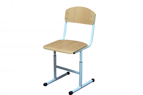 Стілець Т-подібний на круглій трубі, регулюється на ростові групи №4-7 Габаритні розміри: 410х410х380-500 мм Розмір спинки: 410х200 мм. Розмір сидіння: 410х410 мм. Вага: 4,64кг. Сидіння та спинка виготовлені з гнуто-клеєної фанери (товщиною 8-9 мм) та вкриті пластиком HPL товщиною 0,4-0,5 мм. Кути сидіння і спинки та передня крайка сидіння мають радіус заокруглення для запобігання травмування. Каркас стільця виготовлено з круглої труби d32х1,2 мм, d25x1,2 мм та 30х15 мм з нанесенням порошкової фарби. Спинка та сидіння кріпляться до каркасу гвинтами та гайками. Регулювання висоти стільця здійснюється за допомогою гвинтів по отворах каркасу і ніжки, між якими встановлена пластикова перехідна втулка. На торцях каркасу закріплені пластикові наконечники, які запобігають травмуванню учнів та пошкодженню підлоги. На каркасі присутнє маркування ростових груп при регулюванні висоти стільця. Колір каркасу: салатовий (RAL6018), сірий(RAL7035), жовтий. Колір HPL: бук, дуб молочний, жасмін, блакитний. Можливі комбінації кольору каркасу та HPL: - жовтий каркас - HPL бук, дуб молочний, жасмін, блакитний; - сірий каркас - HPL бук, дуб молочний; - салатовий каркас - HPL бук, дуб молочний.