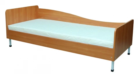 Ліжко одно-спальне з заокругленими спинками, захисна боковина ліворуч Габаритні розміри: 1936х840х(660-570) мм. Вага: 42,37 кг. Ніжки ліжка – квадратна металева труба, розміром 25х25 мм, товщиною 1,2 мм. Покриття нанесене напиленням порошкових полімерних матеріалів. Спинки ліжка із заокругленими кутами, виготовлені із ДСП ламінованої 18 мм, ПВХ - 1 мм. Колір ДСП: бук. Колір каркасу: салатовий (RAL6018) або сірий (RAL7035).