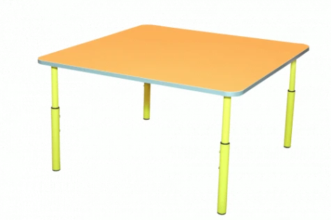 Стіл дитячий квадратний, регулюється на ростові групи № 1-3 Габаритні розміри: 830х830х460-580 мм. Вага: 11,5 кг. Каркас виготовляється з круглої металевої труби d25 та d32 мм товщиною 1,2 мм. Покриття наноситься напиленням порошкових полімерних матеріалів. Торці труб захищені пластмасовими наконечниками. Стільниця виготовляється з кольорового ламінованого ДСП товщиною 16 мм. Кромкується крайковою стрічкою ПВХ-21х1,0 мм кольору "алюміній". Колір ДСП столешні: бук, апельсин, жовтий, лайм, синій, червоний. Колір каркасу: жовтий, салатовий (RAL6018) або сірий (RAL7035).